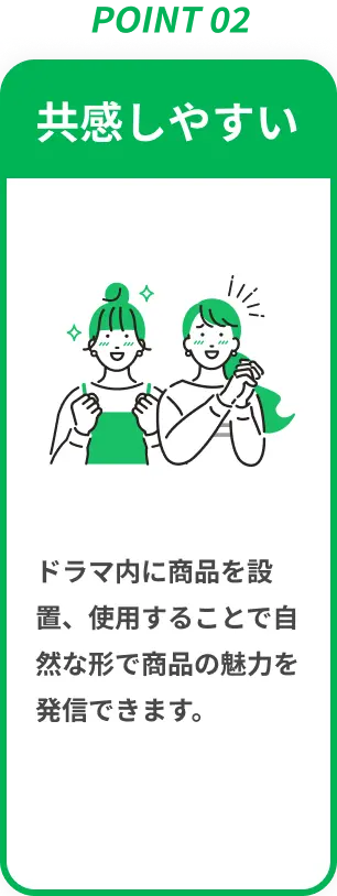 ドラマ内に商品を設置、使用することで自然な形で商品の魅力を発信できます。
