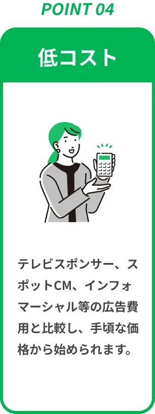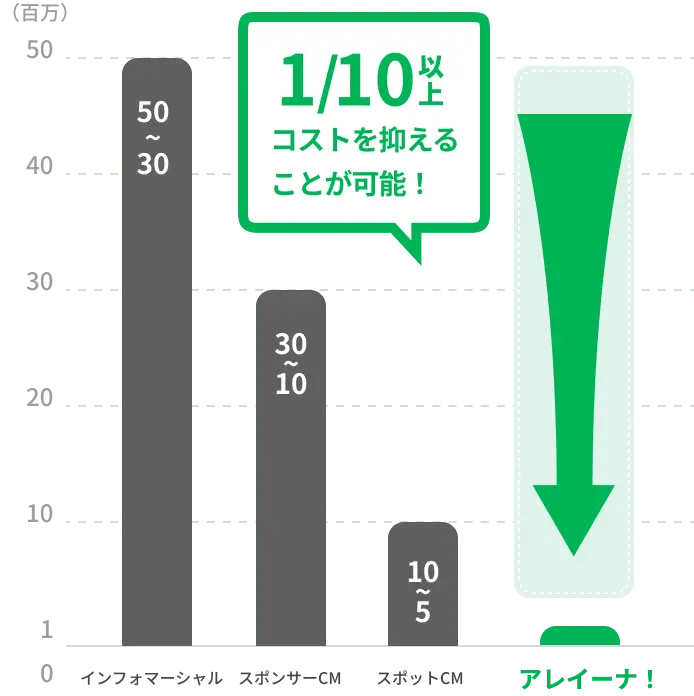 テレビスポンサー、スポットCM、インフォマーシャル等の広告費用と比較し、手頃な価格から始められます。